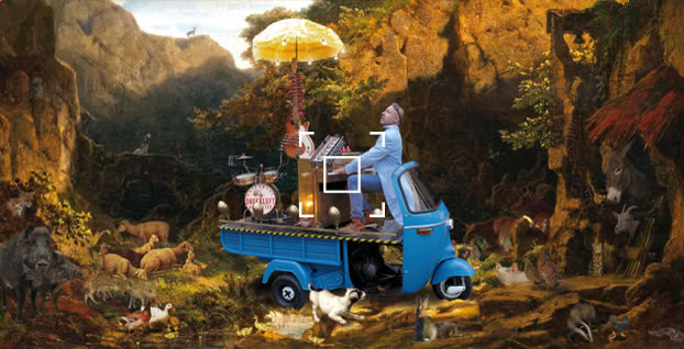 Das Universal Druckluft Orchester fährt im Dienste des Amüsements viele Kilometer mit einem Trans-porter zu seinen Auftrittsorten. Für diesen „Reifenabdruck“ möchte sich das Ein-Mann-Orchester bei Mutter Erde etwas revanchieren.